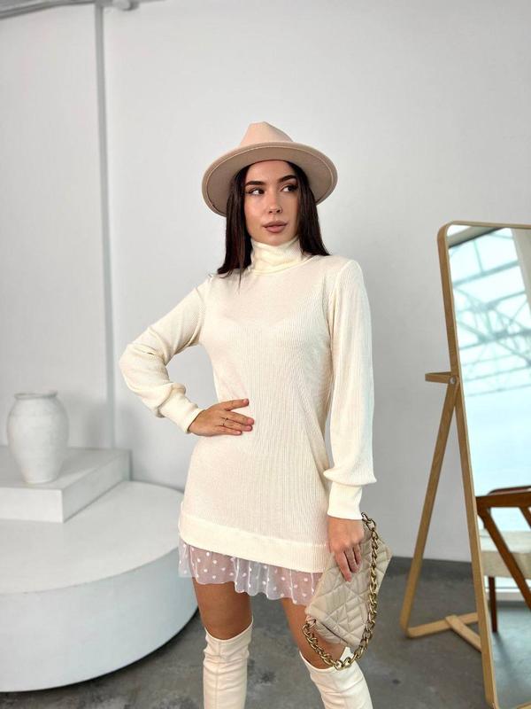 Платье-туника из ангоры в рубчик уютное теплое платье с сеткой в горох