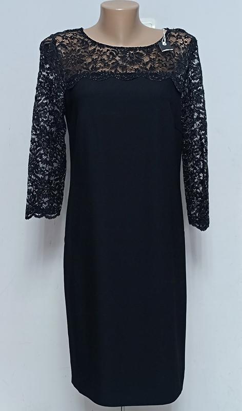 Платье женское модное классическое. Женское платье - символ женственности, элегантности и хорошего вкуса. Элегантное приталенное платье, по спинке молния. Такое платье идеально сочетается с высоким каблуком, пальто, кардиганом. Подойдет как на праздники, так и на каждый день вырез горловины - круглый, сезон - демисезон, декор - вверх и рукав гипюр черный с золотым, цвет - черный, ткань - креп, посадка - приталенная, длина модели - платье до колена, длина рукава - три четверти. Полуобхват груди: 47 см, Полу обхват талии: 43 Обхват стегон: 48 см Длина изделия: 97 см