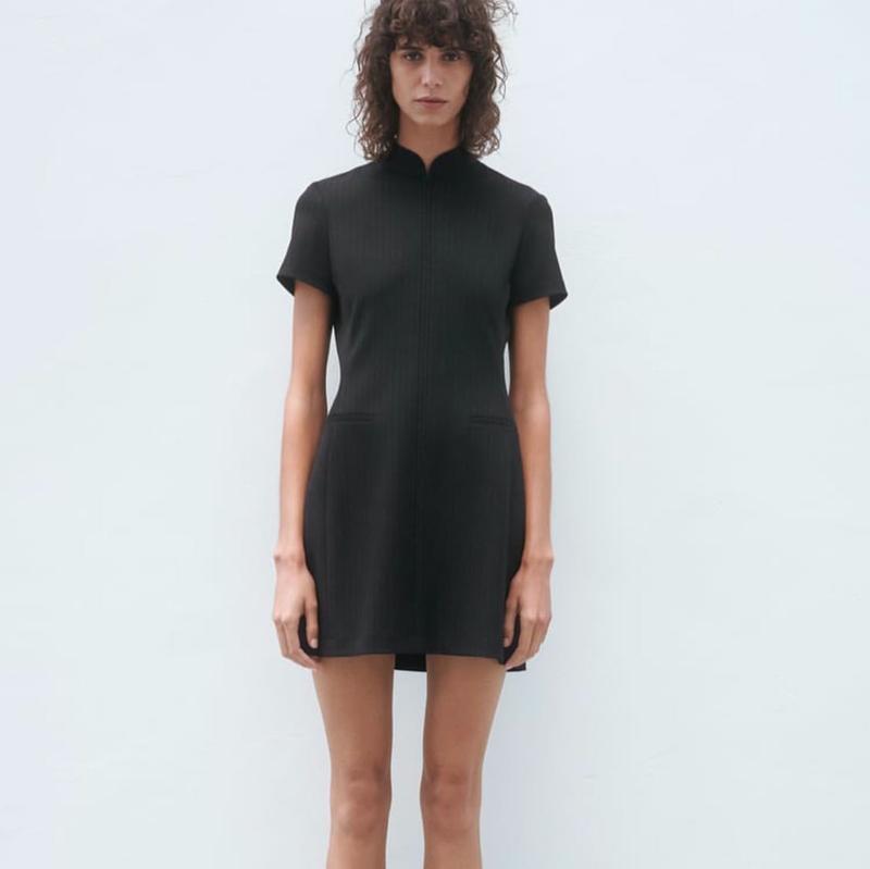 Платье мини в тонкую полоску из смеси шерсти и вискозы Зара Zara S размер Цвет темно синий Короткое платье из смесовой вискозы и шерсти Вырез на воротнике, воротник стойкой, короткие рукава Ложные прорезные карманы спереди Потайная застежка молния сзади Ткань 62 полиэстр, 26 вискоза, 9 шерсть Седает очень красиво по фигуре Отличное качество Новая с бирками Замеры: грудь 44, талия 35,5 бедра 47, длина 85