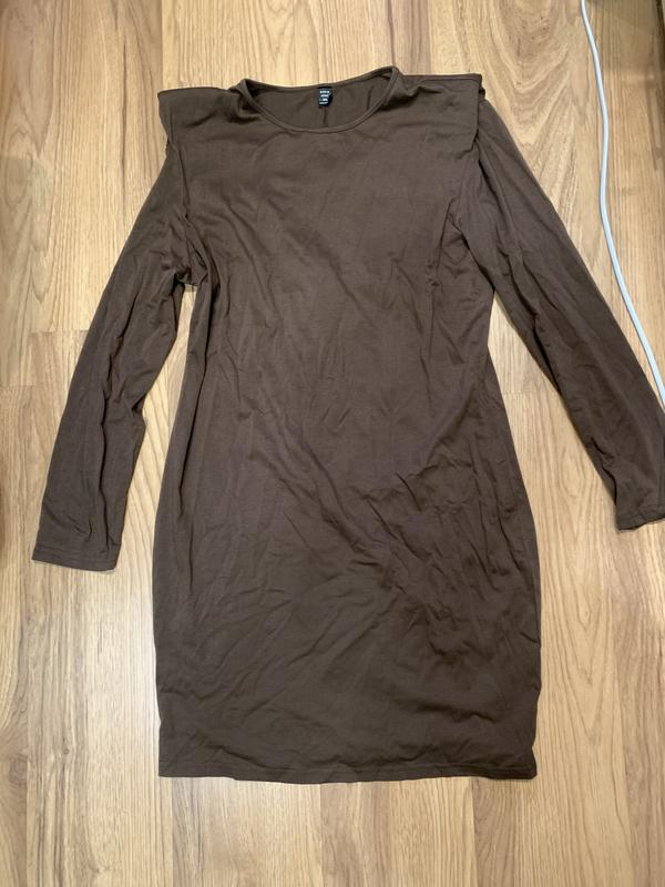 Платье на новый год модное тренд с необычными плечами трендовое коричневое шоколадное с от...