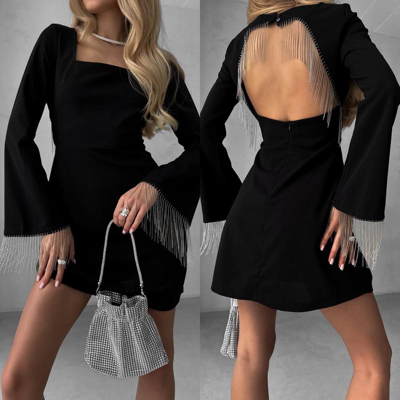 Модель 5601 Женское платье Размерный ряд S,M,L,XL Тканина костюмна Цвет черный и молоко Очень красивое и нарядное платье, с стильными в этом сезоне подвесками по рукавам и спинке Застегивается верх на пуговицы, по спинке молния Супер качество Цена 930 грн.катр
