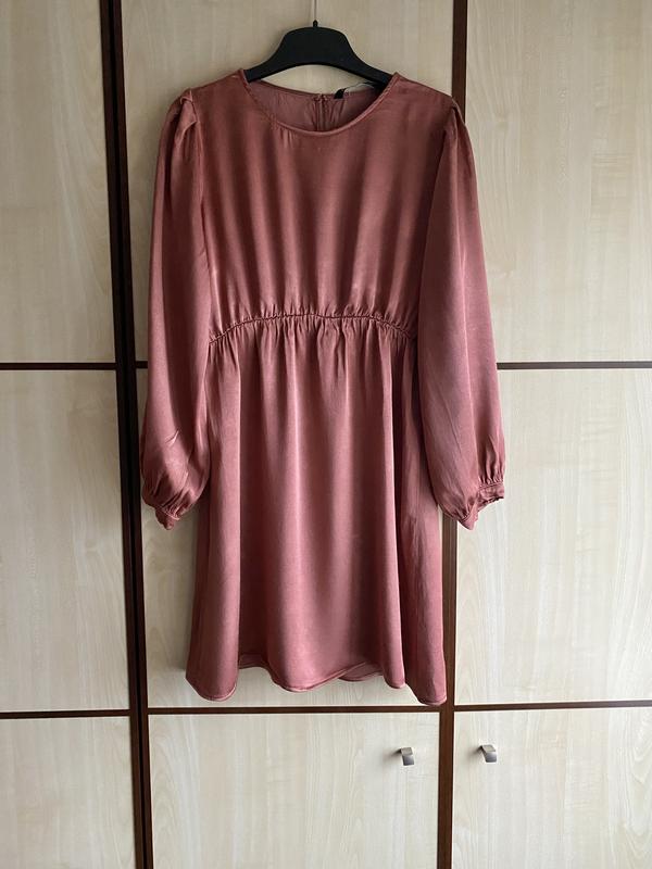 Платье Zara из вискозв, по фактуре как атлас. Длина 83 см, плечи 37, рукав 54, по талии резинка 34 см, тянется до 46, по бедрам свободно - 50-54 см