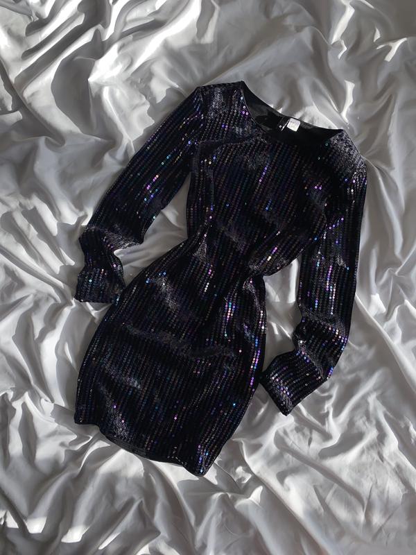 Чорна коротка оксамитова новорічна сукня в паєтки, сукня міні на довгий рукав h&m