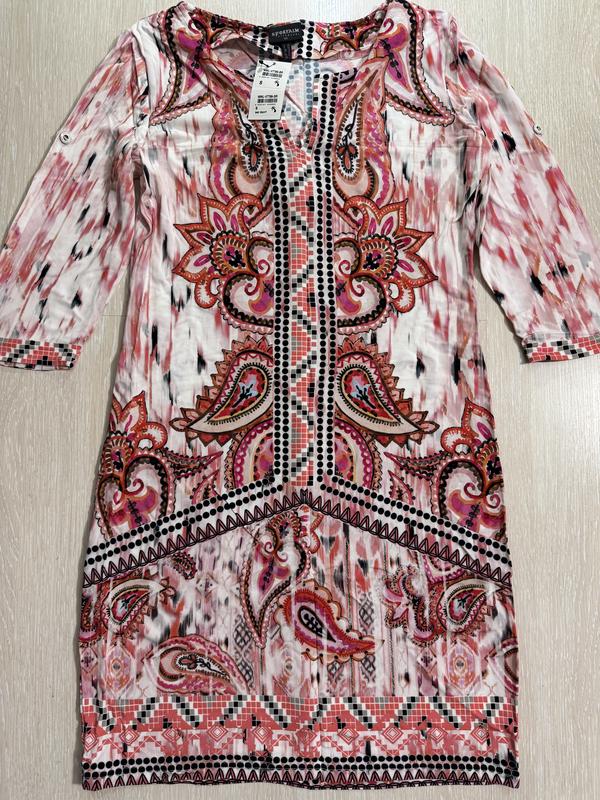В наличии красивое платье фирмы SPORTALM. Размер указан S..по замерам хорошо будет и на 10. Состав: 100% вискоза..ткань очень мягенькая и приятная к телу, хорошо тянется. ПОГ-47+ещё хорошо тянется, длина платья-90, плечи-39, длина рукава-44, полуобъём в талии-41+тянется, в бёдрах-47+хорошо тянется