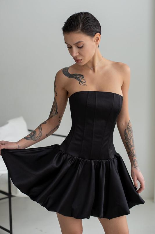 Короткое атласное платье с корсетом и мини юбкой баллон
