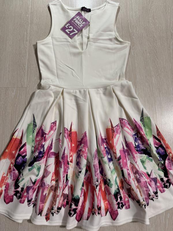 В наличии красивое платье фирмы EVITA. Размер указан 10, но немного маломерит и по замерам больше идёт на 8. Состав: 95% полиестер и 5% эластана ..ткань мягкая и приятная к телу, хорошо тянется. ПОГ-40..тянется до 45, длина платья-90, плечи-32, полуобъём в талии-36, в бёдрах- свободно.
