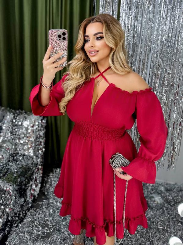 Сукня арт. vst. 250 Ткань: костюмка с напылением молний Завязкой на груди можно запросто регулировать объем Цвета: гранатовый, электрик, изумруд, бежевый Размеры: 50-52, 54-56, 58-60