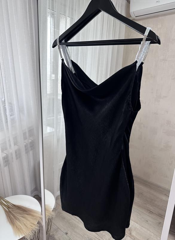 Чорна міні slip-dress зі стразами на бретелях Misspap 🖤 Ідеальна міні black dress, йде на підкладці, гарні бретелі зі стразами та відкрита спинка, тканина матова з глянцевим напиленням. Розмір: S, довжина 88 см (регулюється), пОГ 47 см, талія 38 см, стегна до 50 см 🔖polyester ✔️нова.