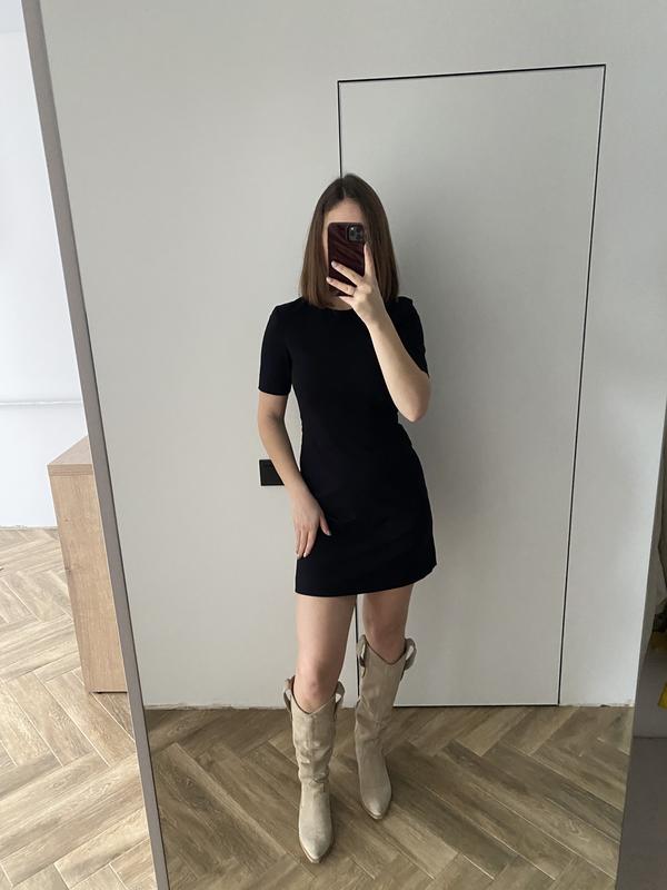 Трапецієподібної форми, красиво підкреслює фігуру, дуже базова, можна багато з цим комбінувати. Плотна тканина, взаді потаємний замочок на всю спину. Довжина по спинці 87 см, в плечиках 38 см, в грудях 39, талія 34 см