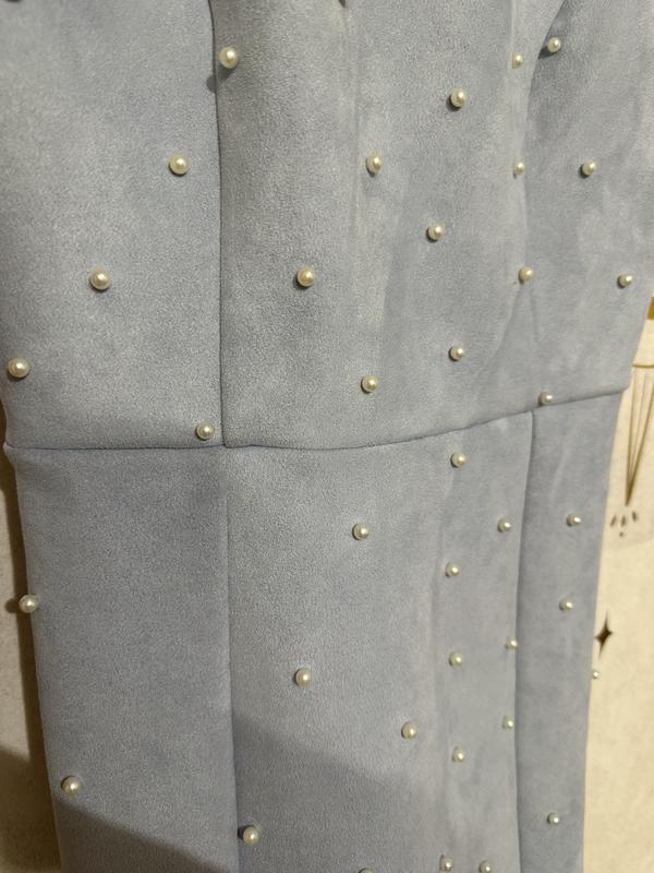 Розмір на бірці ХС, але сукня еластична, добре підійде також на С, чи навіть М. На бедра 98 , талію 78 теж підходить. В житті колір ніжно блакитний. Дуже приємне на дотик. Приталена сукня, але добре тягнеться. Виглядає дорого.