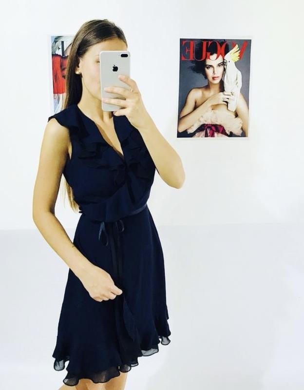 Легкое, воздушное платье из натуральной ткани- вискозы. Украшена воланами, которые еще больше добавляют легкости. Состояние отличное, без дефектов. Оделала один раз. Длина 88см Ширина может регулироваться при необходимости, ведь платье на запах. Поэтому +/-5см от указанных замеров может быть. Ширина под руками (по спине) 43-44см Ширина в области талии (по спине от шва до шва) 36см Ширина в области бедер ориентально 51см