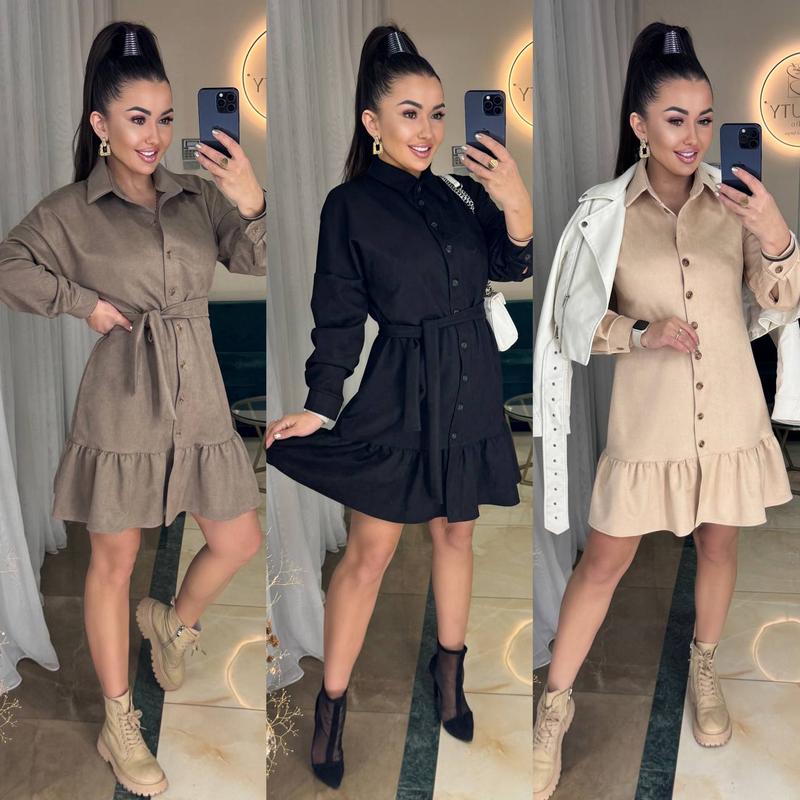 Замшевое женское платье Размерный ряд S,M,L,XL Ткань замш ( очень качественный, приятный на ощупь, не тонкий ) Цвета беж, шоколад и черный Застегивается платье на пуговицы У коплекті пояс Супер качество Цена 680 грн