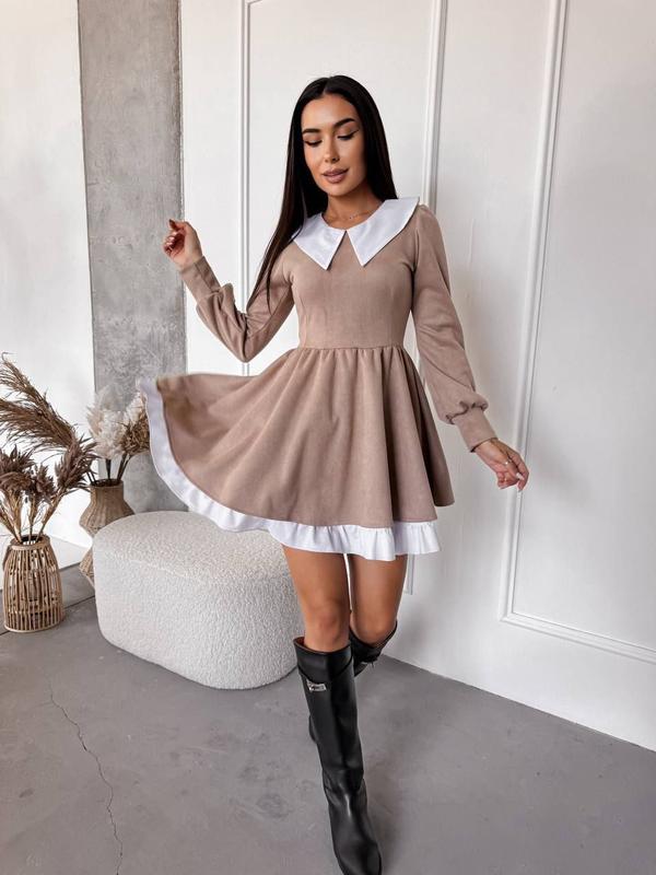 Платье: с съемным белым воротником, застегивается молнией на спинке, + съемная белая юбка, Арт. 10494 Ткань: замш на дайвинге с добавленным белого коттона Производство: Турция Цвет: бежевый, графит Размер: с-м(42-44) Об.. гр. 84-90 см. Об.талии 62-68 см. Длина 83 см. Размер: м-л(46-48) Об. гр. до 90-96 см. Об.талию до 68-72 см. Длина 84 см. Цена 950грн