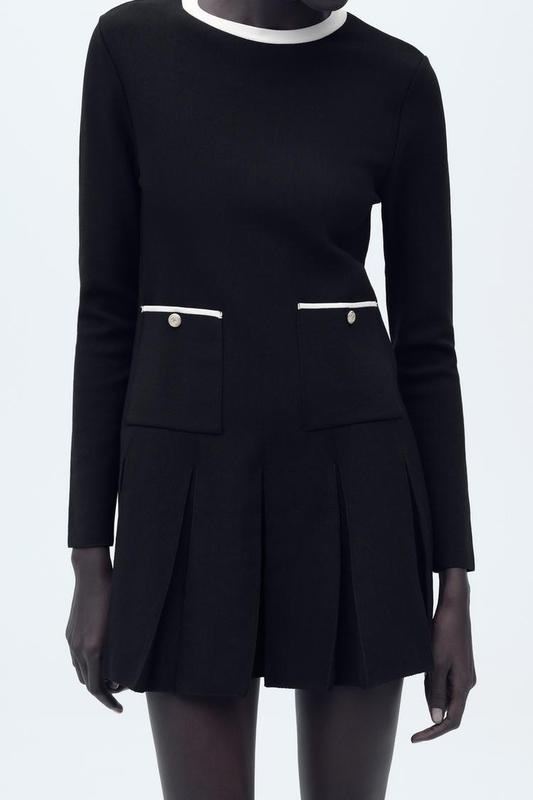 Цена 2250 Платье с круглым вырезом и длинным рукавом. Передние накладные карманы. Контрастная отделка и плиссированный край. Черный / Белый | 3859/127/084