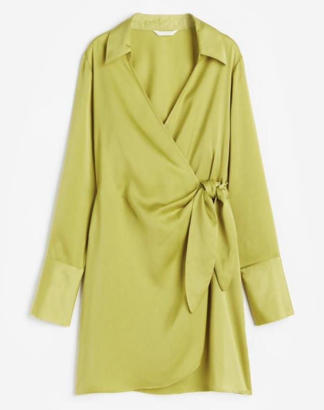 Короткое платье из мягкого атласа с драпировкой с воротником и оберткой спереди с широкими завязками с одной стороны и узкими скрытыми завязками с другой. Мягко спущенные плечи, длинные рукава и широкие манжеты с разрезом и пуговицами. Шов на резинке сзади на талии. Без подкладки.