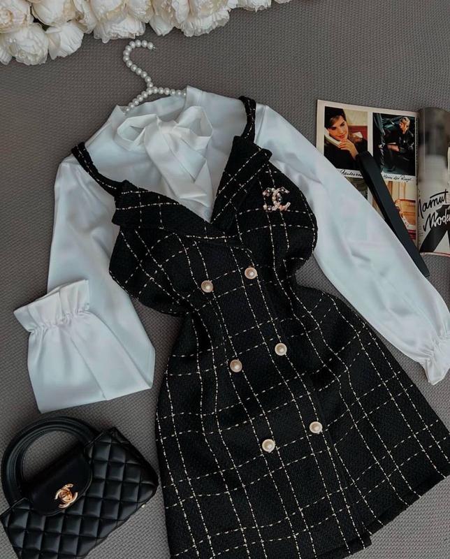 ✨НОВИНКА✨ Комплект - 2ка с брошью😍 Модель: 181 Размеры: 42-44; 46-48. Ткань: Твид + Софт(Брошок как на фото)✨ Цвет: Черный+белый.