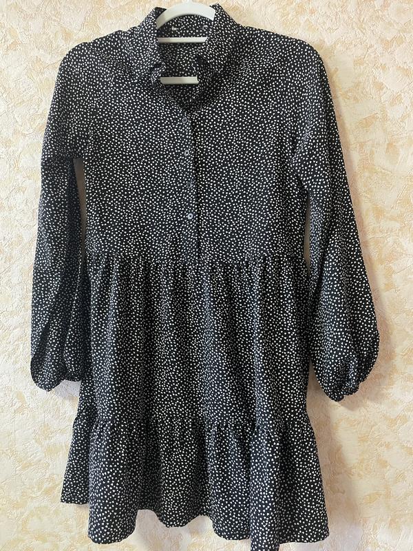 Черное платье с белым мелким принтом в виде сердечек. Имеет воротник, длинный рукав на резинке, пуговицы спереди, и легкий, расклешенный крой с рюшами на подоле. Ткань легкая и приятная на ощупь. Идеальный вариант для повседневного образа или работы.