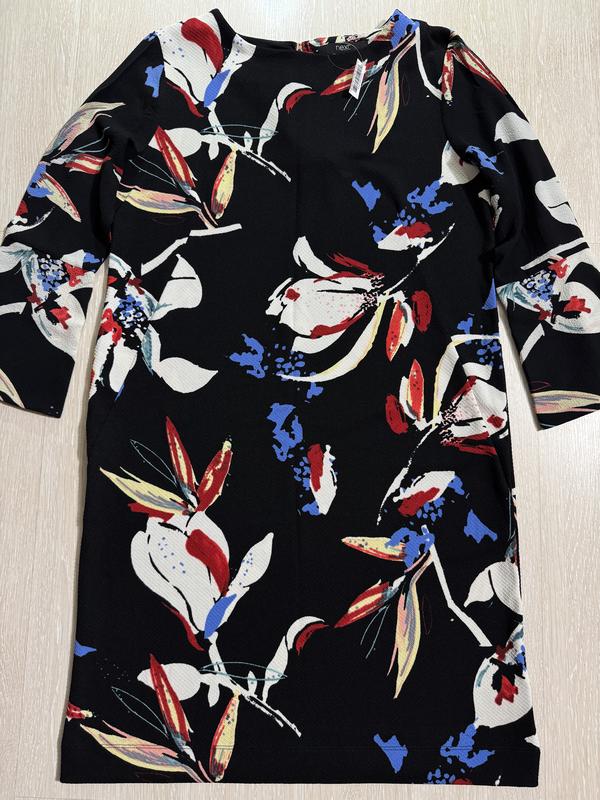В наличии красивое платье фирмы NEXT. Размер указан 10. Состав: 95% полиестер и 5% эластана, ткань хорошо тянется. ПОГ-50+ещё тянется, длина платья-92, плечи-40, длина рукава-50, полуобъём в талии-48+ещё тянется, полуобъём в бёдрах-50+ещё тянется.