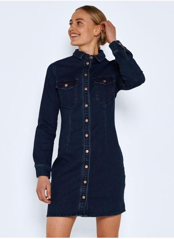 П... Однотонное и облегающее женское платье из денима от Noisy May имеет длинные рукава и планку на пуговицах спереди посередине и двумя нагрудными карманами. 27017672-DBD