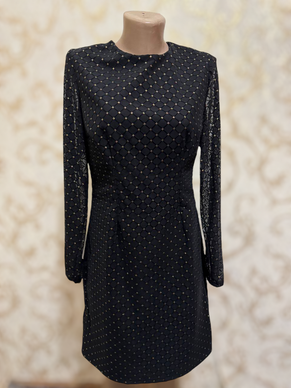 В наличии платья на маму и дочку в черном цвете. Трикотажная сетка с глиттерными стразами ( золото). Снизу фатин. Детская На голову бантик На возраст где-то 10-12 лет Цена 1300. Доросла Размер М Замеры : Длина от плеча до талии - 35 см Полуобхват талии - 40 см Общая длина - 92 см
