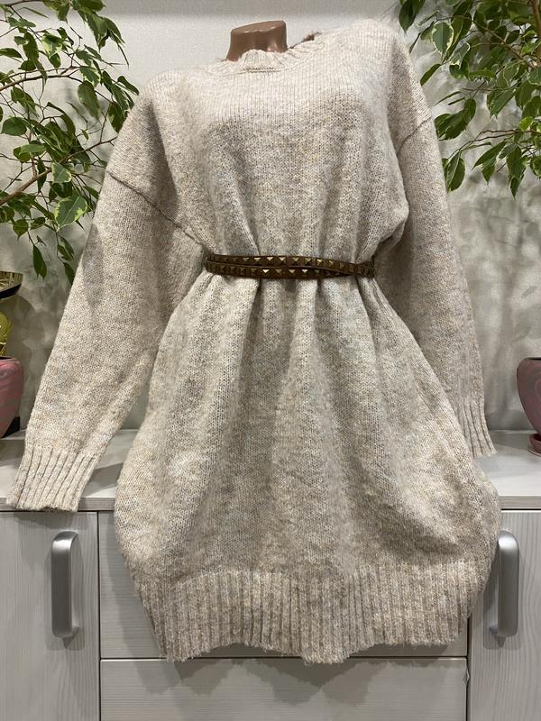 Очень плотное теплое вязаное платье свитер приятного нюдового цвета Известный бренд Фасон оверсайз, большой размер Состояние без дефектов Поясок использован для демонстрации, не продается, при вашем желании - могу положить в подарок Замеры: Длина от плеча - 90 ПОГ - 65/85 Ширина по низу - 65/85 Длина рукава от горловины - 77 Замеры в спокойном/ растянутом состоянии