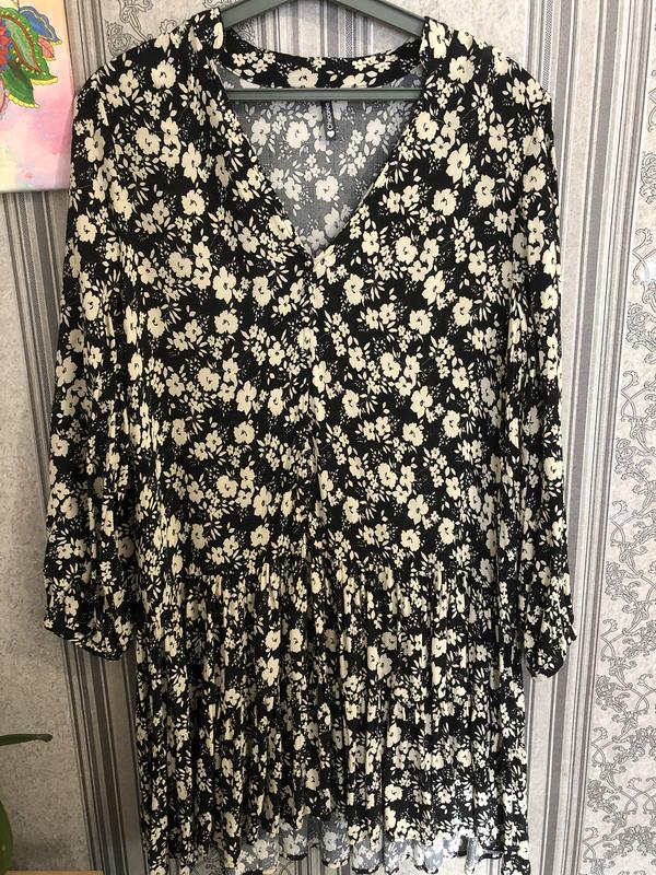 Платье свободного края, понижу со сборочкой. Длина 92 см, пог 53 см, плечи 42 см, рукав 3/4, рукав 63 см
