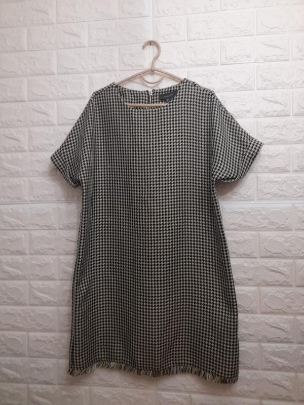 стильное классическое платье с интересным принтом, сзади на замочке и необработанным низом Полу/ объем груди-50см, длина рукава-30см(от шиии),длина платья-84см
