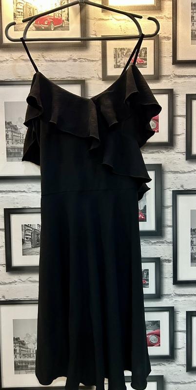 Легка чорна сукня у дуже хорошому стані, на тонких бретелях, розмір M/L. Тканина м’яка, приємна на дотик, «жатка». Сукня відрізна по талії, зі спідницею-кльош. Горловина декорована оборкою-воланом, яка спереду переходить в оригінальну драпіровку. На спинці по верхньому краю вставлена тонка резинка, що забезпечує ідеальне прилягання до фігури. У бокові шви вшитий пояс, який зав’язується ззаду. Заміри: • Ширина в області грудей — 38 см у нерозтягнутому стані, 46 см із розтягнутою резинкою. • Ширина талії — 46 см (регулюється поясом). • Довжина сукні — 96 см.