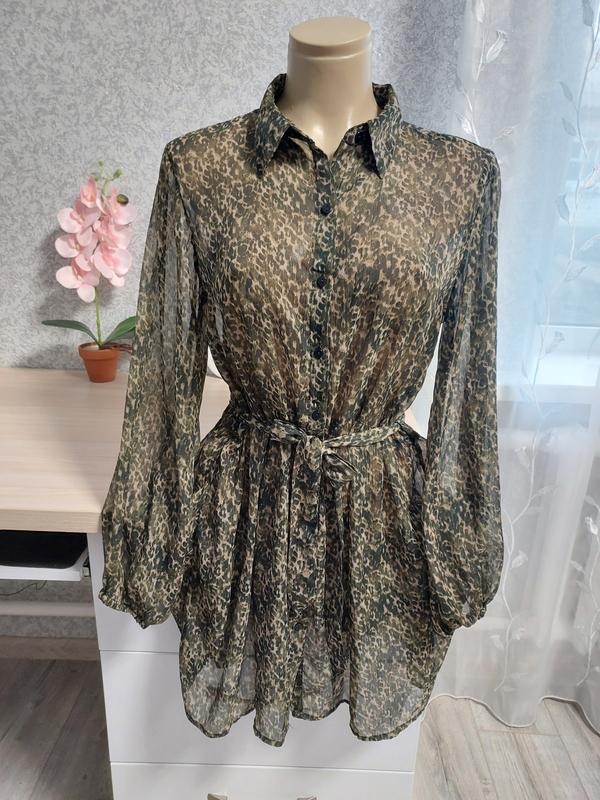 Женское полупрозрачное, мини платье рубашка от бренда Stradivarius, с полиэстра, размером М. В идеальном состоянии, не тянется, свободного кроя, с переда застегивается на пуговицы, и есть поясок в тон платья. Все замеры на фото, качество отличное, длинный рукав, в низу на резинке. Маде ин Индия.