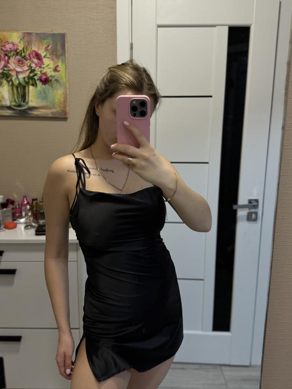 Сатиновое мини платье с разрезом на левую ножку С завʼязками зверху
