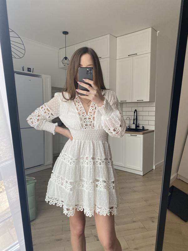 Шикарна сукня з вставками хорошого мережива. Ефектно виглядає, білосніжна. Розмір s-невеличка m. Стан ідеальний. Купувалась за 2 тис., одягалася 2-3 рази.