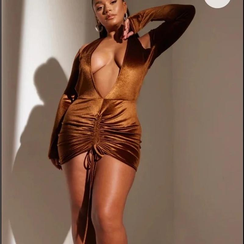 Шоколадно-коричневий оксамитовий матеріал, сукня із глибоким декольте та акцентними вирізами. Абсолютно нова. В такій сукні ви точно не лишитесь осторонь компліментів!