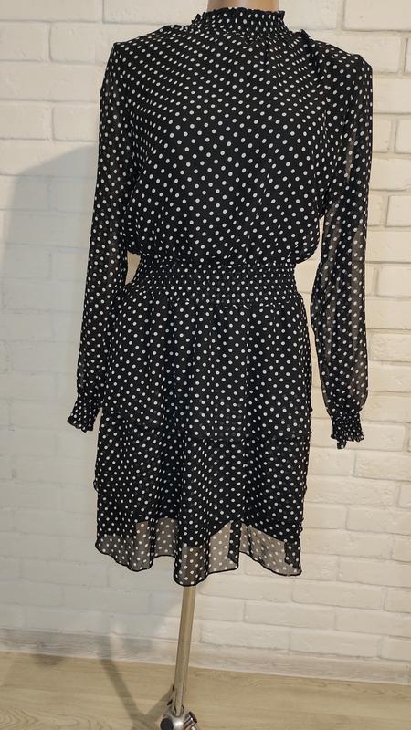 Красивое женское платье черного цвета с белым горошком. Изделие выполнено из легкой и полупрозрачной ткани, что добавляет образу легкости и утонченности. Имеет высокий воротник с рюшами, длинные рукава со сборками и эластичный пояс, подчеркивающий талию. Низ платья многослойный, придает романтичный вид. Идеальный выбор для вечерних прогулок, праздников или других особенных событий. Идеальное состояние, размер европейский 10. Замеры НПО груди 48 см., НПО талии 32-41 см., НПО бедер 52 см., длина рукава 60 см., длина платья 90 см.