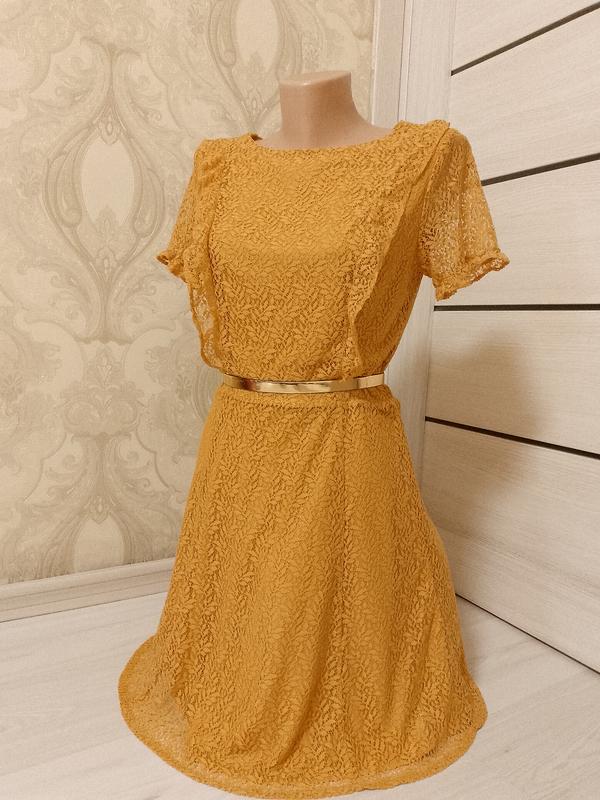 Платье гипюровое кружечное с рюшами/ New look. Цвет оранжево горчичный. Размер указан 10. Може бути xs,s, m. Линия под подмышками 44 см, тянется больше до 55 см. Линия груди 42 см, тянется больше до 52 см Линия талии 36 см, также тянется. Длина от плеча 86 см. Плечи 36 см Длина рукава 19 см. Внутри стретч подкладка. Сзади застежка молния 50 см. Без пояка.
