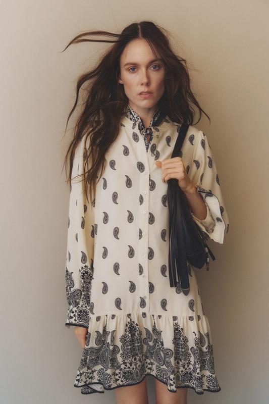 Ціна 1080 Нова колекція Коротка сукня з віскози з принтом. Модель вільного крою з коміром мао, гудзиками спереду та довгими рукавами-ліхтариками з розрізом і гудзиком на манжетах. Збірка на спідниці для ефекту кльош. Артикул №: 1265602003