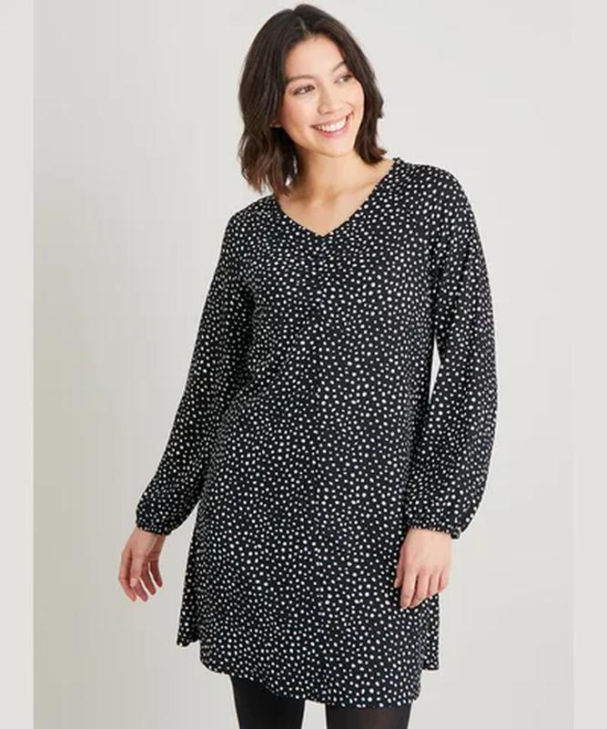 Это стильное платье от бренда TU. Длинный рукав. Свободного кроя. Размер по набору 14 - L/XL. Ориентируйтесь по замерам Размеры Н/о груди- 51 Низ н/о- 76 Длина по спинке -85 Длина рукава от ворота-68см