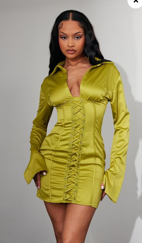 Оливковое атласное платье на косточках-шнуровке. Размер :XL-2XL(указан 16) Длина 90см, длина рукава 66см, пог 53 см(можно больше)пот 46см, поб 56 см, сбоку замок,гарно тянется.