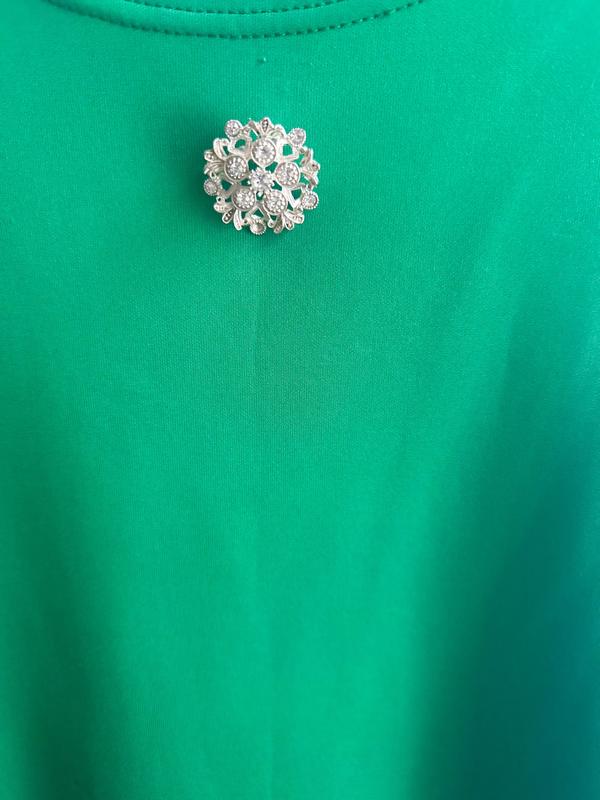 Зелена сукня .Гарно сяде по фігурі ,тканина Масло.Гарно тягнеться.Розмір М-L.В комплект іде брошка яка відстібаєця , Пог70-85 Пот-60-75 ПоБ 80-90 Довжина 90 см. Нюанс ,невеличка затяжечка в районі талії,але на тілі загалом видно не буде.Звертайтесь