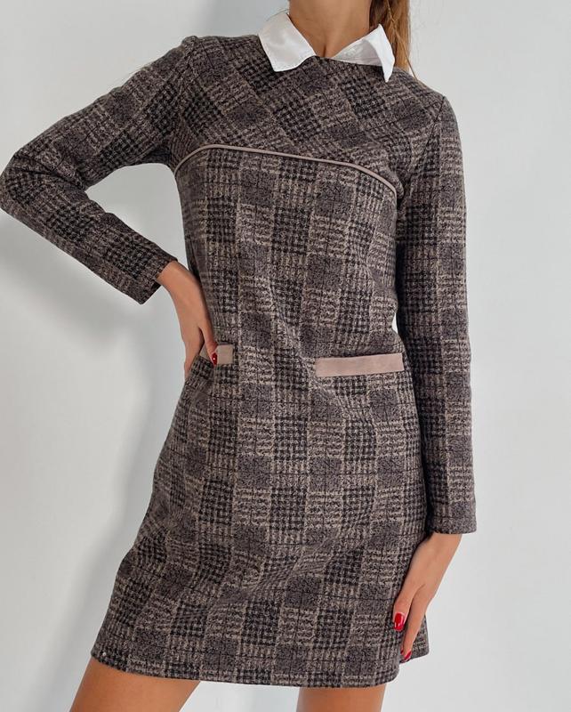 арт 200682/1 407 Стильное платье прямого кроя из жаккардовой ткани с кокеткой. Декорована замшевим кантом. Спереди прорезные карманы с замшевой листочкой. Застегивается на молнию по спинке. Размер с 44 по 52 Тканина Жаккард Состав 35% шерсть, 35% вискоза, 30% полиэстер