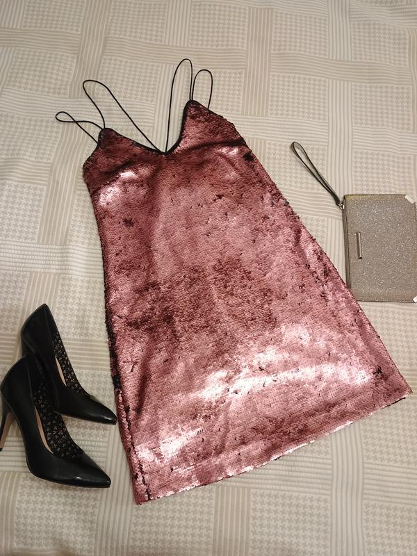 коктейльное платье с двухсторонними пайетками от new look цвет розово-черный матовый ткань на подкладке, не просвечивается сзади на застежке состояние новой, без нюансов длина 84 см ПОГ 36 см ❗Бронь товара после придания реквизитов 1 сутки (длиннее по предыдущему условности), далее бронирование отменяется.