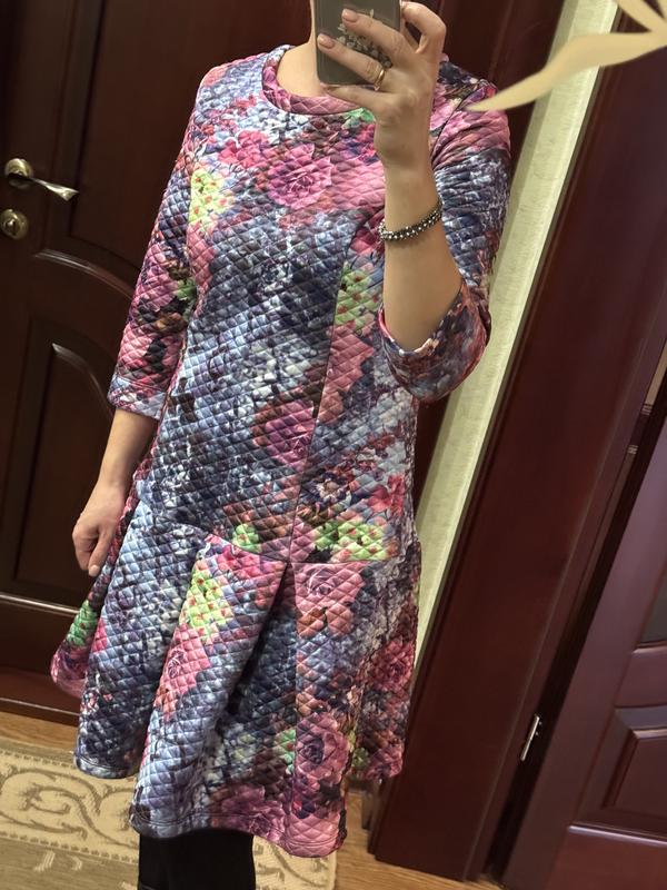 Платье в цветной принт подойдет на размер 42-44, длина 94 см, полуобхват груди 44 см, ткань тянется