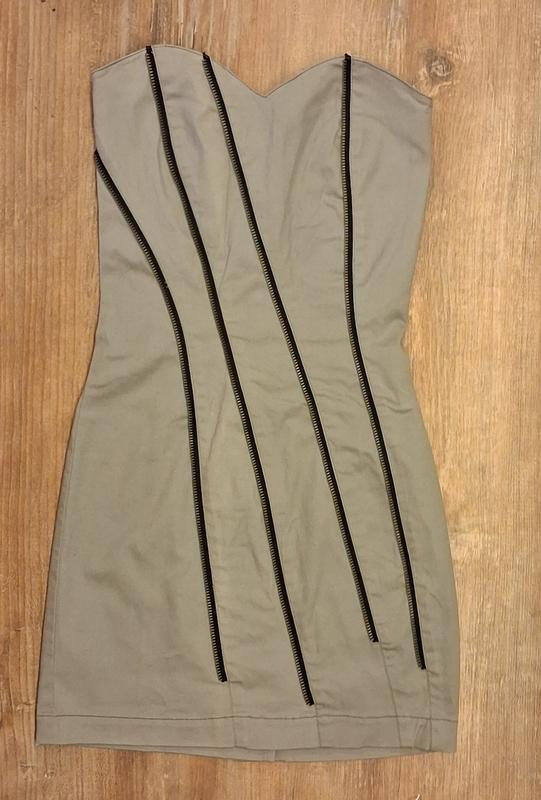 Мини-платье серого с акцентными молниями-рисунком спереди. Сзади застегивается на молнии. Есть разрез для облегчения ходьбы. Тканина не тягнеться. Состав: 83% хлопок, 13% полиамид, 4% эластан. Замеры: полуобхва талии 29 см, пиохват груди- 34 см. Длина платья по спине 61 см. Для дополнительной информации/фото - пишите.