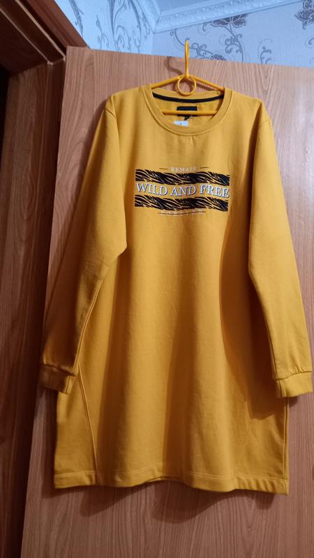 💢 Женское платье-туника горчичного цвета на флисе, с принтом в виде надписи и велюрового украшения, с круглым вырезом горловины, с длинным рукавом, прямого фасона - по бокам с треугольными клиньями, приятный мягкий и тёплый материал с большей долей котона, тянется. 💢 Прекрасное повседневное платье-туника для осеннего, зимнего и весеннего сезонов, удобное, приятное, тёпленькое, мягкое, отличной расцветки 👍👍👍 💢 Размер: 46/48(54/56), 💢 замеры: ОГ-до 130, ОБ- до 130, длина- 97см. 🔊 ОТПРАВЛЕНИЕ ПОСЫЛКИ В ЗАКЛЮЧ 📬