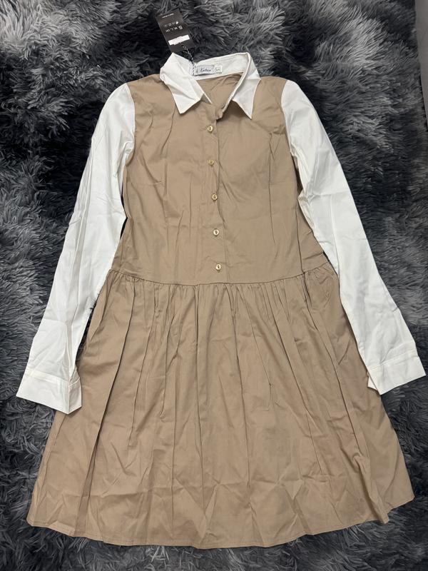 Очень стильное платье-рубашка Комбинированный цвет, белый и бежевый Красиво садится по фигуре, свободного кроя, размер S, подойдет на 42-44, новая, покупала дорого, но немного прогадала с размером
