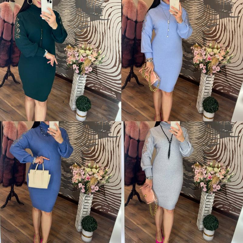 удивительно красивое, теплое и уютное платье прямого силуэта с высоким горлом, на резинке внизу и рукавах, согреет вас в холодное время года и будет отлично смотреться на работе, вечеринке и в повседневной жизни, оно выполнено из трикотажа машинной вязки, приятного на ощупь, высокого качества декорированного яркой эффектной аппликацией из сетки и пришитых страз размер оверсайз 42-46 длина 96-98 см, пг 46-48 см хорошо тянется, длина рукава от шеи 66-68 см код 0496 арт.да о058