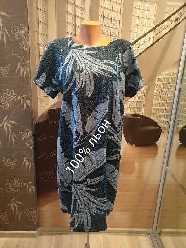 плаття від відомого англійського бренду next , лаконічна модель вільного крою , короткий рукав реглан підкреслений декоративним елементом , рукавчик вільний , застібка гудзик , синьо блакитна кольорова гама , складник 100% льон , розмір 14 , заміри на фото