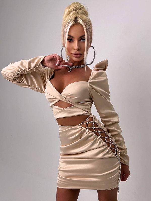 👆Сукня міні з драпіруванням, декорована стразами Тканина - атлас Розміри: S, М