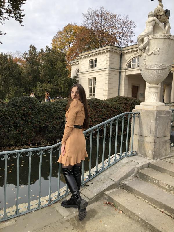 Платье на длинный рукав, верх как бы на запах, размер л, красиво тянется, без пояса