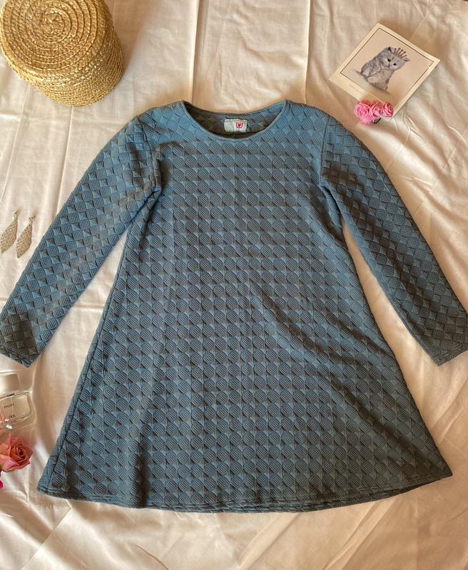 Очень красивое серо-голубое стеганное платье. Коротке. На длинный рукав. Тепле. Длина 66. Свободное.