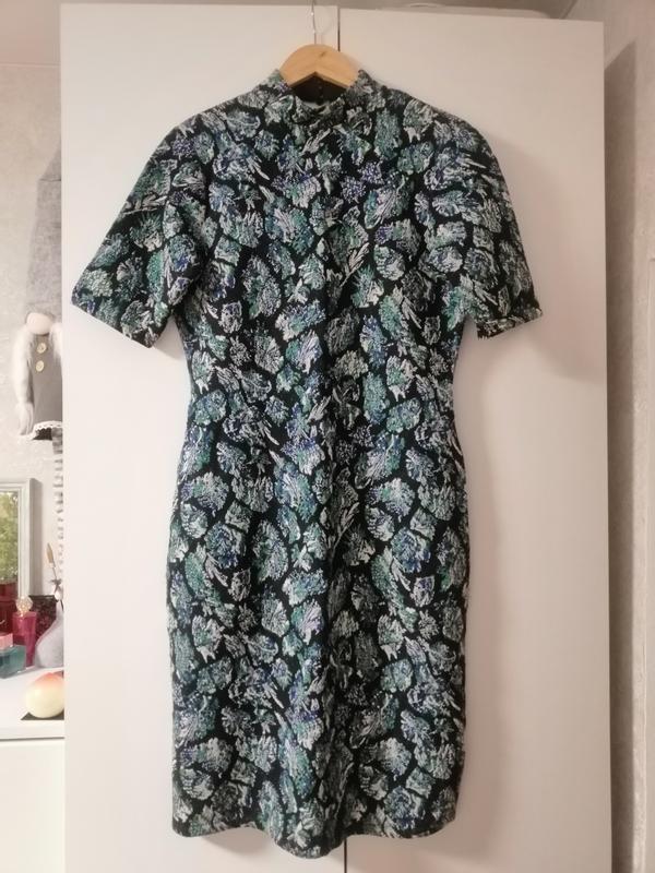 Платье M&S, размер 14 (М, L) в отличном состоянии. Длина платья 103 см, ширина полу объем в области груди 52см. Ткань плотная, слегка тянется. Склад:81%коттон,9%люрексовая нить, 3%еластан,3%полиамид.
